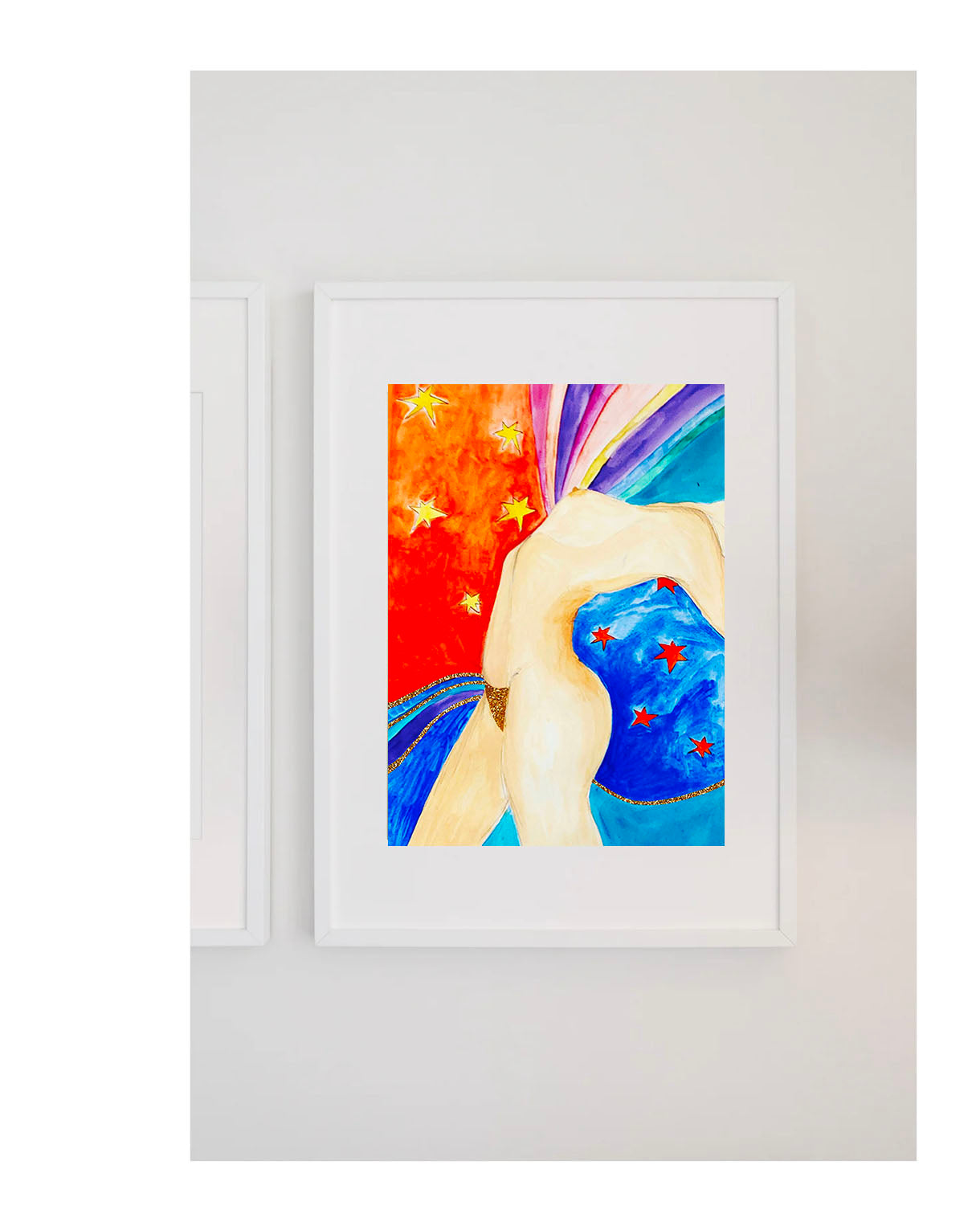 This unique piece, measuring 50 x 60 cm, is created using watercolor and pencil. It comes in a simple white frame, with custom framing available upon request